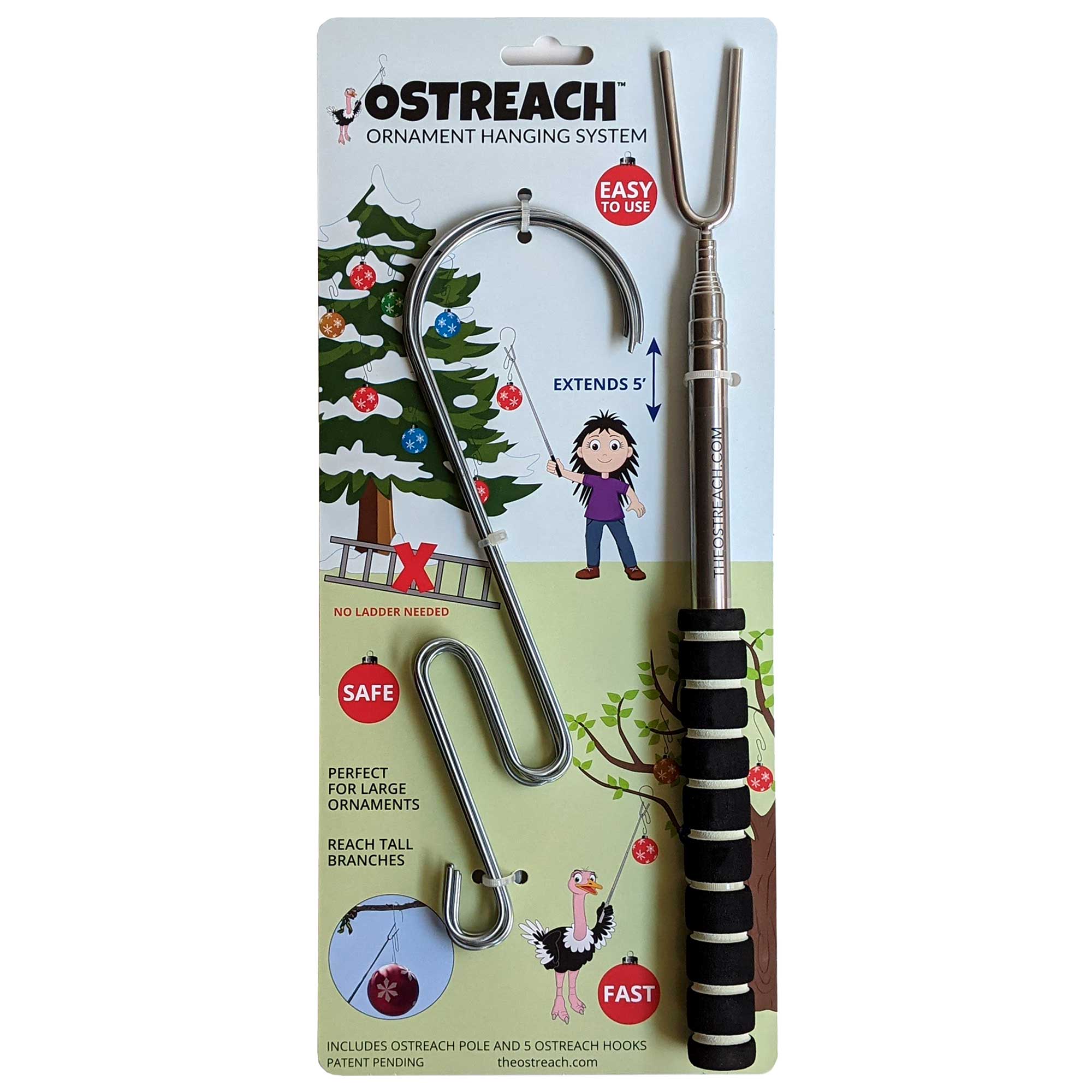 Ostreach Ornament Hanging System is the safe, fast, and easy way to decorate your outdoor trees. Designed for tall tree decorating, this patented outdoor tree decorating tool lets you hang and remove ornaments quickly – without a ladder! Large ornament hooks are perfect for hanging oversized Christmas ornaments or spooky Halloween ornaments.